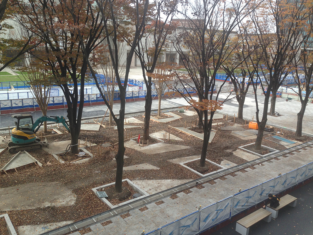 雨水貯留浸透基盤の設置完了、三角形はベンチの基礎