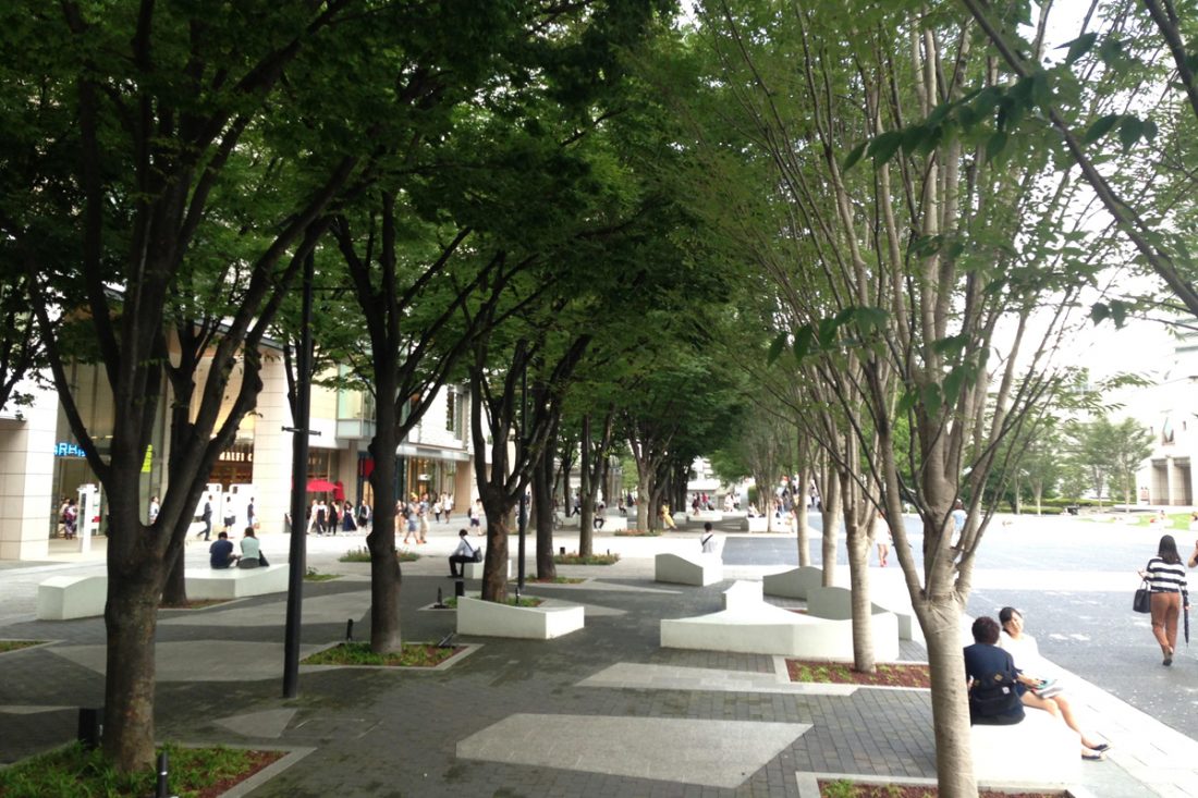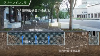 横浜市のグランモール公園は、新たなまちづくりの中心的存在として改修されました。賑わいの場としての公園は大胆にグリーンインフラ技術を採用して大きな水循環の仕組みを実現しています。 緑陰だけでなく、地下からの雨水のしみ上がりによる蒸散や旺盛に生育する樹木からの蒸散作用を活用して「夏でも涼しい」空間が創出されています。