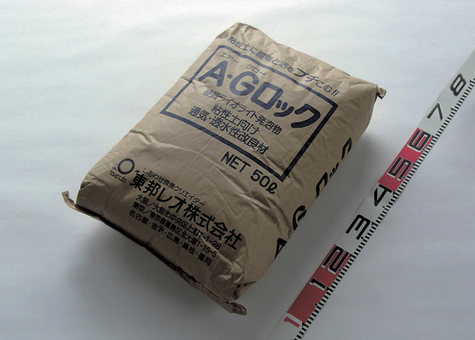 | 設計上の留意点 | 粘性土は、造成過程での泥濘化と締め固め、そして経年変化による粗間隙の減少が欠点と言えます。改良には透水性に主眼をおき、粗間隙を増加させることが必要です。改良目標値は、透水係数が10-5m/sec(10-3cm/sec)程度以上、粗間隙が10~15%程度です。土壌にA・Gロックを10~15%混入し、植穴底敷用にホワイトロームTCを使用します。 |