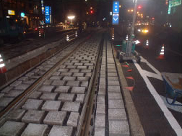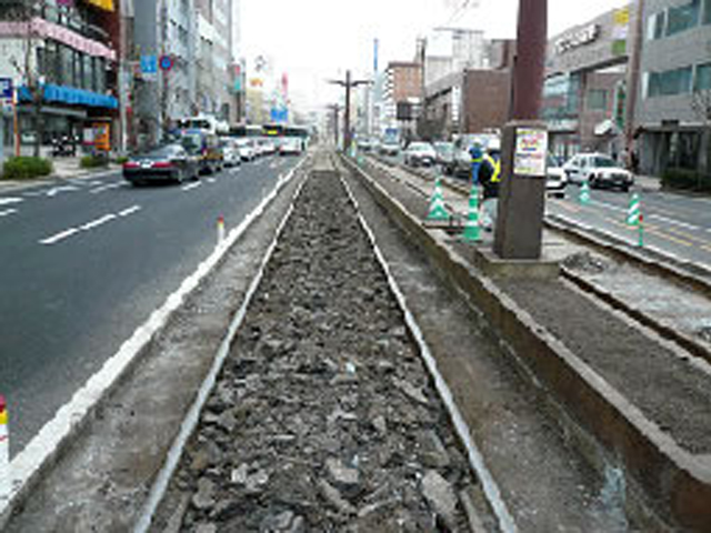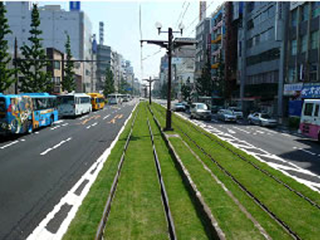 このLRTと合わせて、都市のヒートアイランド現象の緩和効果や都市景観の向上に貢献する「軌道敷緑化」への関心が高まっています。アスファルト舗装やコンクリートが打設された軌道が緑で覆われることで、周囲の温度が下がります。また、低床式車両と軌道敷緑化導入によって騒音や振動が減少するとともに、街の景観を欧米のような風格ある雰囲気に演出することも可能です。
