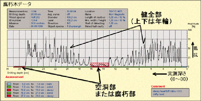 外観からは判らない腐朽の程度や大きさを調べるために、専用の特殊診断機器を使用します。中でも世界的に標準機器となっているレジストグラフは、直径1.5mmの細いキリを樹幹に挿入し、そのときのキリにかかる抵抗力の大小により、材の強度あるいは空洞や腐朽などの樹体内部の状態をある程度把握することができる機械です。測定データはキリが貫入する際の抵抗の大きさがそのまま波形グラフとして表示されます。