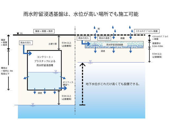 わが国の多くの自治体では、局地的集中豪雨対策としてha当たり約600㎥の雨水流出抑制措置を義務付けています。これをクリアするために、これまではコンクリートやプラスチック製雨水貯留槽を活用し、地上部の改変面積を「狭く」し、その分地下に「深く」建設が進められてきました。しかし昨今は、地下水位が高い場所、曲がりくねった狭い場所などでは、従来通りの方法では雨水貯留浸透施設を設置できない場所が多くあります。それにもかかわらず豪雨対策施設の設置は求められています。図は、従来型と雨水貯留浸透基盤を使用した場合の地下水位からの必要離隔を考慮した場合の設置位置を示しています。従来の場合に比べて、雨水貯留浸透基盤は薄く設置することが可能ですので、地下水位の高い場所での設置が可能となります。また広く施工できれば地中への浸透面積を広く確保できて、浸透適地の場合雨水対策量を安価に増加することができます。