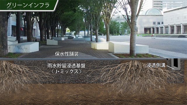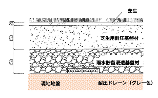 植栽基盤や排水層に雨水貯留浸透基盤材を使用することで、グリーンインフラによるプラスαの機能性を付与した緑地空間をデザインすることができます。