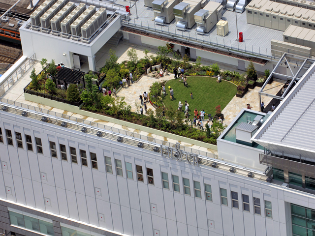 屋上緑化は都市のわかりやすいグリーンインフラです。建築物の屋上を緑化することで、雨水流出抑制やヒートアイランドの緩和、省エネルギー効果といった都市の環境改善効果が得られます。併せて、これからは「緑化」を目的とするためだけの屋上緑化ではなく、人々が集い利活用を促進するための、「資産価値の向上」「賑わいの創出」「地域の魅力向上」といった複合的な価値を生み出すグリーンインフラ型の屋上緑化の重要性が高まると私達は考えます。