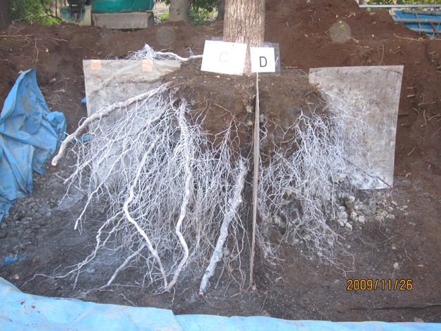 基盤の違いによる生育の変化。同一固体の根に対し、右の基盤はコンクリート再生砕石のみ、左はそれに腐植をコーティングした植栽基盤をセットした。4年4ヶ月後の根系の成長の差は明確