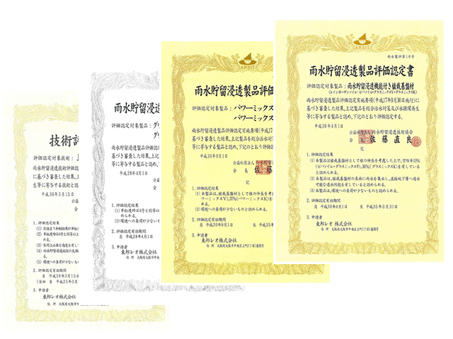 雨水貯留浸透基盤材の各製品(J・ミックス、パワーミックス、グラスミックス、ビバソイル)は、総合治水対策及び水循環再生等に寄与する製品と認められ、評価認定を受けています。雨水流出抑制施設として使用が可能。 ( 公益社団法人 雨水貯留浸透技術協会 )