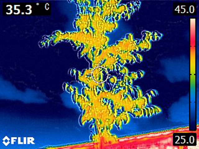 側溝および保水性ブロックから入った雨水は、雨水貯留浸透基盤を介して地表までしみ上がり、保水性ブロックに供給される。保水性ブロックからの蒸発により、地表面温度が低いことがわかる。