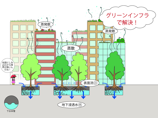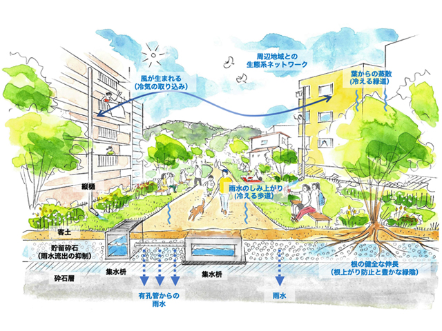 自然界は、地下に浸透した雨水の地表面からの蒸発、また植物が吸水・蒸散することで、空間の温度上昇が抑制されるという合理的な仕組みを持っています。都市部においてコンクリートや舗装材が蓄熱することで起こるヒートアイランド現象に対して、自然界が持つ水循環システムを都市部で再現することにより抑制しようというのがグリーンインフラの考え方です。その為に重要となるのが、水循環を意識した全体設計です。雨水が植栽基盤や舗装材に貯留・浸透し地表までしみ上がる機能や、植物の健全な生育による葉からの蒸散作用を活用した「冷える」空間づくりを通じて、都市の問題を解決します。