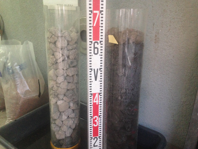 【しみ上げ試験】 左;コンクリート再生砕石のみ しみ上げ高8cm 右;コンクリート再生砕石に腐植コーティングを施した。 しみ上げ高60cm