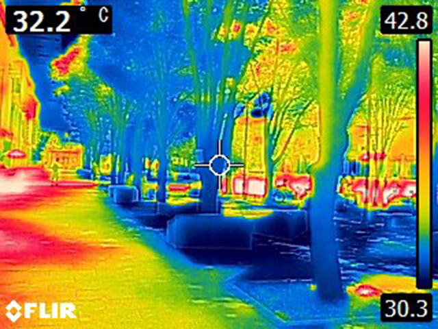 グリーンインフラを導入した樹木は、従来型の植栽と比較して樹冠温度が低く、葉からの蒸散作用が活発なことがわかる。