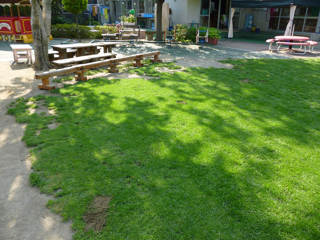 都市部の園に多い。地方の園と比較して、1人当たりの芝生面積が狭く、芝生へのダメージが大きい。1年を通じて園庭を利用する為には、休眠している暖地型芝草を日々の利用から守る為WOS※が必須。