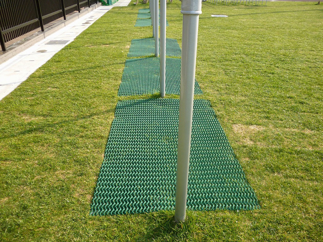 遊具の周りは過度の踏圧で芝生が禿げ、基盤が掘れてしまいます、そうした場所では保護材を利用するか、人工芝にすることをお勧めします。