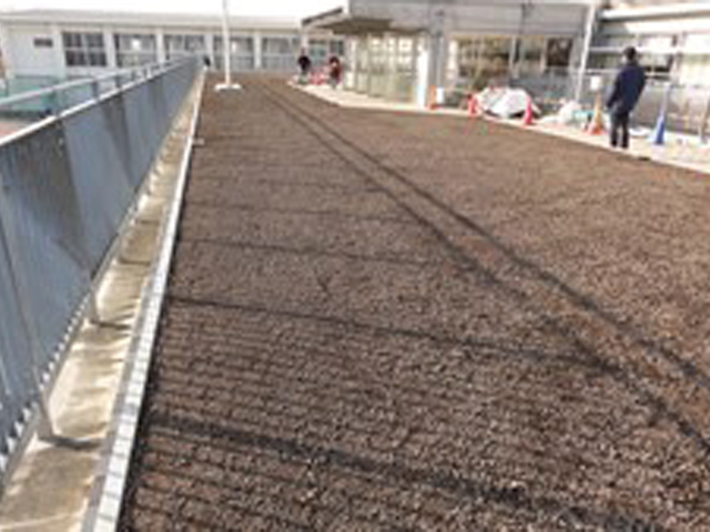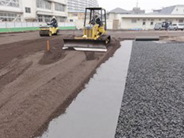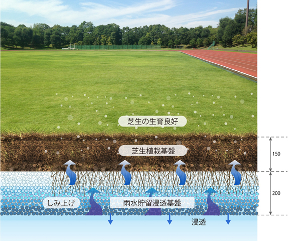 児童(園児)一人当たりの芝生面積や利用頻度など、芝生が受けるダメージや回復力のバランスを考慮した設計が必要です。基盤土壌として、芝生用耐圧基盤土壌/雨水貯留機能付植栽基盤材(グラスミックス)を使用します。締め固まりを起こさず、耐圧と根が伸長する空間を確保した工法です。