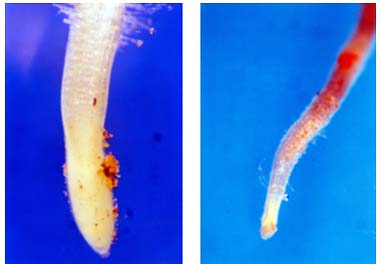 ハツカダイコン主根の先端(左:正常pH6.0 ss右:障害pH12.0)