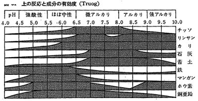 微量要素が欠乏すると、植物に現れる障害は「葉脈が浮き、葉は黄変してネクロシスを呈する」と説明されている。土壌反応と成分の有効度に関しては、Truogの図がよく使われるので、参考にすると分りやすい。