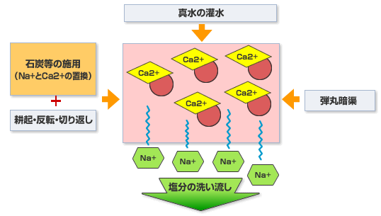 - サブソイラ、弾丸暗渠により、土壌水分の地下浸透を促進 圃場に真水を入れ、代かきして塩分を洗い流す。