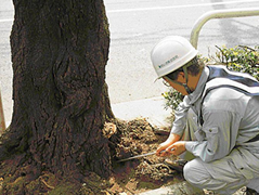 そこで、同一の樹木診断技術をベースに国土交通省国総研が開発した独自の診断器具等を用い、樹木の発するサインを定量的に明らかにし、診断結果を基に樹木の状況に合った管理作業の計画や、根上がりへの対策など、具体的な解決策を提案しています。