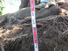 10年ほど前から、「桜の根が歩道の舗装を持ち上げて困っています」というお問い合わせが増えてきました。これは、サクラに多くみられる根の生育特性から起きる現象で、「根上がり」といいます。樹木根系図説(著者:苅住 昇)によると、サクラの代表品種ソメイヨシノの根は、地中の浅い位置に根をはり、細根が0.5mm以上に肥大する生育特性を持っています。そのため舗装直下に太い根が発生しやすく、これが根上がりの原因になります。